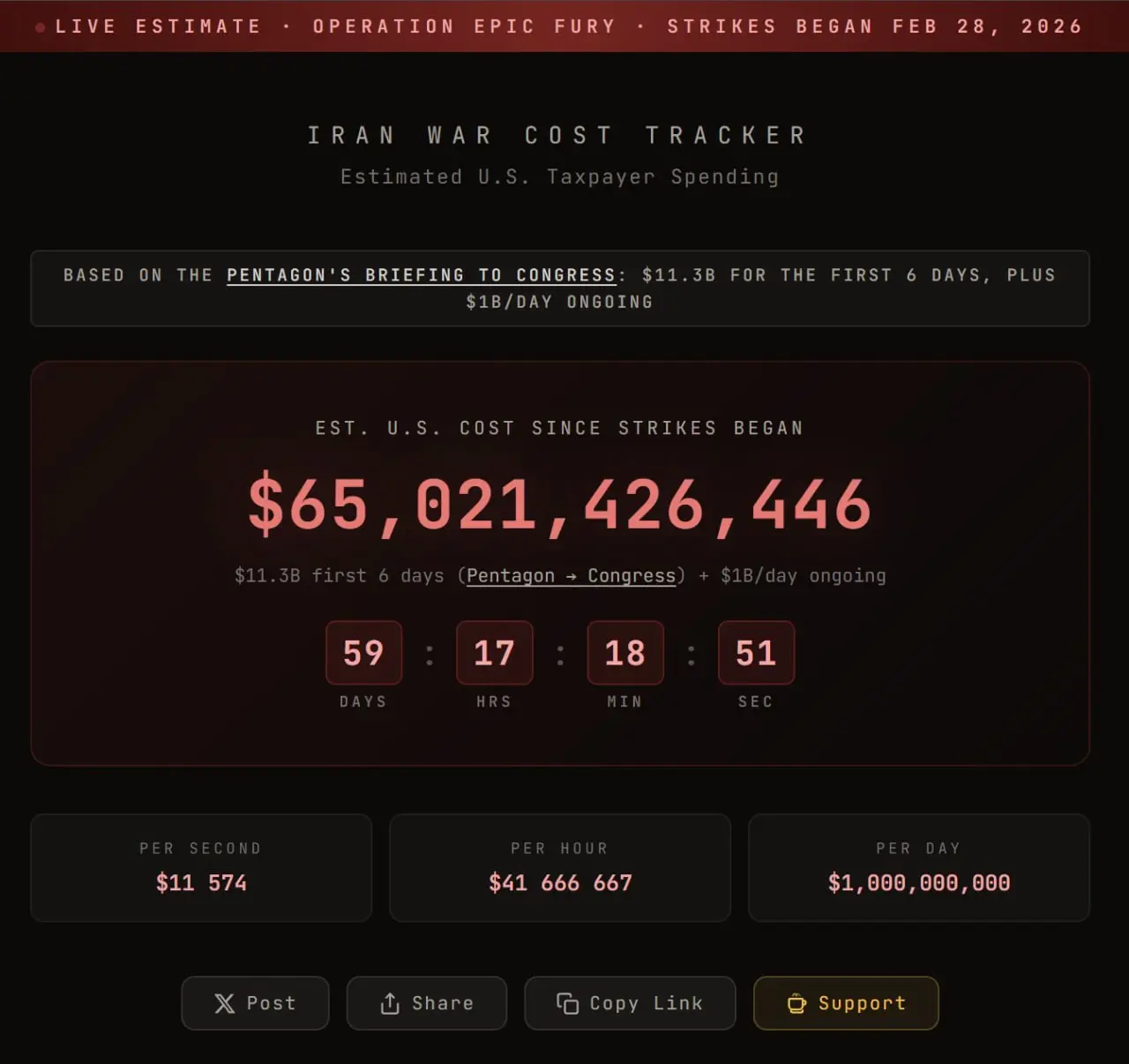 Portalın metodologiyasına əsasən, hesablama Pentaqonun Konqresə təqdim etdiyi məlumatlara söykənir: əməliyyatların ilk 6 günü üçün 11,3 milyard dollar, sonrakı günlər üçün isə təxminən gündə 1 milyard dollar əlavə xərc götürülür. “Iran War Cost Tracker” öz səhifəsində bu rəqəmin real xərclərdən aşağı ola biləcəyini də qeyd edir.