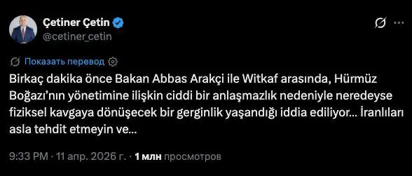 ABŞ və İran arasında İslamabadda keçirilən danışıqlarla bağlı Türkiyəli jurnalist Çetiner Çetinin yaydığı “Araqçi ilə Uitkoff arasında Hörmüz boğazına görə kəskin mübahisə az qala fiziki qarşıdurmaya çevrildi” iddiası hazırda böyük beynəlxalq agentliklər tərəfindən ayrıca təsdiqlənməyib.