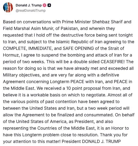 “Reuters”-in məlumatına görə, bu qərar İranın Hörmüz boğazını “tam, dərhal və təhlükəsiz” açması şərti ilə verilib və Tramp bunu “ikitərəfli atəşkəs” adlandırıb. O, həmçinin Tehrandan 10 bəndlik təklif aldığını və bunu danışıqlar üçün işlək baza saydığını bildirib.