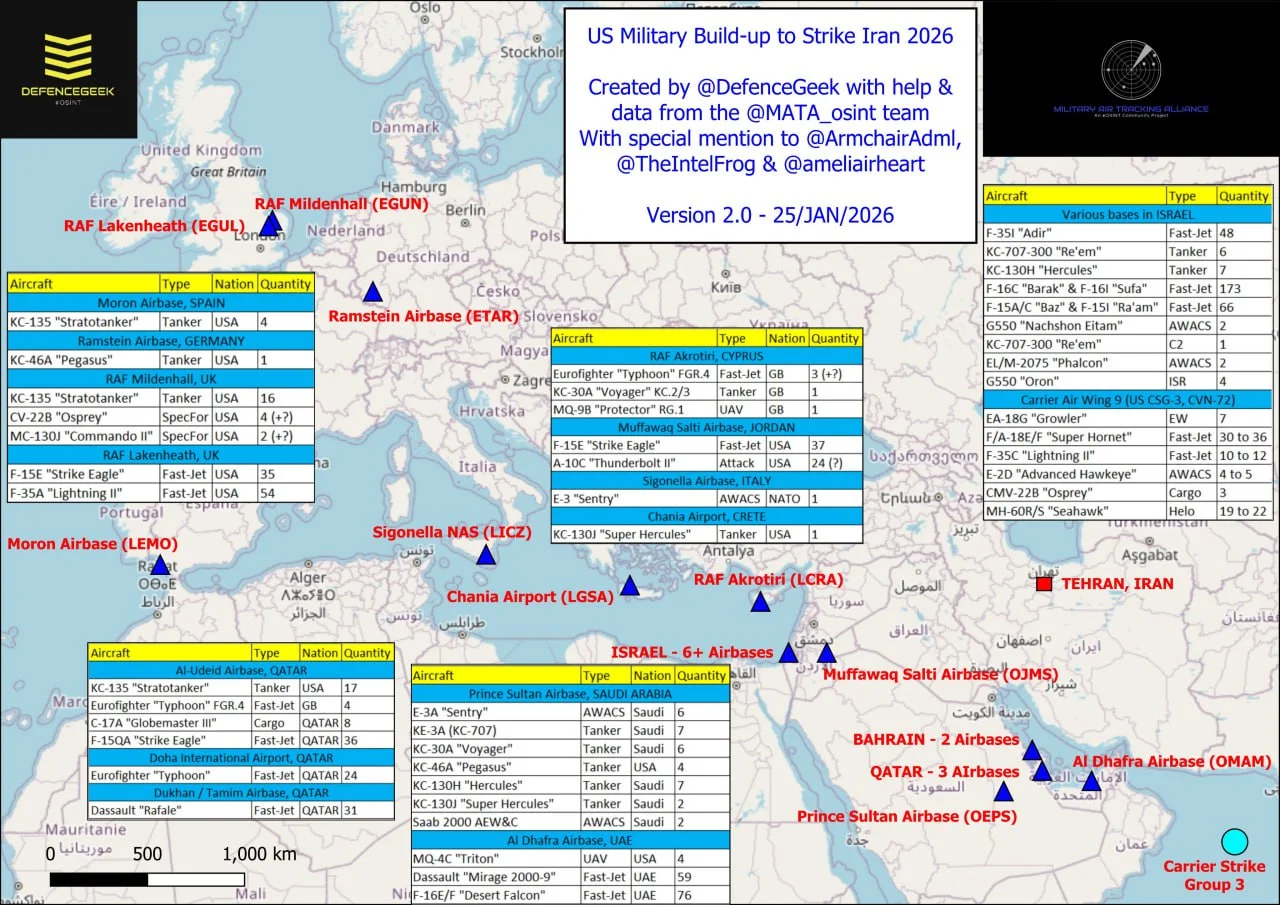 İranın bilavasitə yaxınlığında ABŞ Hərbi Hava Qüvvələrinə məxsus 37 ədəd “F-15E Strike Eagle” zərbə təyyarəsi yerləşdirilib, bölgəyə çatan “USS Abraham Lincoln” aviadaşıyıcısının aviaqrupunda isə təxminən 10 ədəd “F-35C Lightning II” və “F/A-18E/F Super Hornet” göyərtə qırıcısı xidmətə hazır saxlanılır.