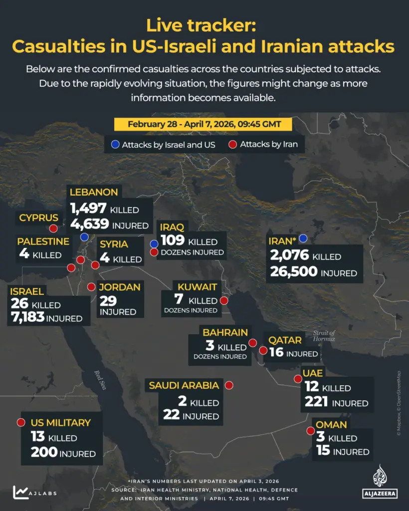 Al Jazeera” telekanalının 7 aprel saat 09:45-ə olan vəziyyətinə əsaslanan canlı itki izləyicisində ABŞ-İsrail hücumları və İranın cavab zərbələri nəticəsində bölgə üzrə ağır insan itkiləri göstərilib.