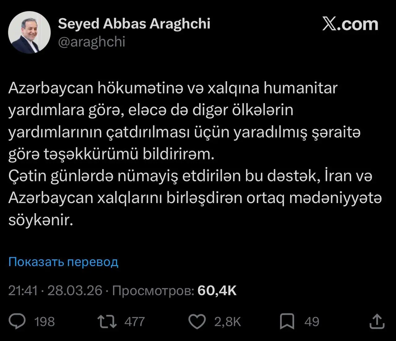İranın xarici işlər naziri Abbas Araqçi Azərbaycan hökumətinə və xalqına humanitar yardıma görə təşəkkürünü bildirib.
