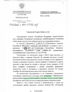“BT News” kanalının botuna anonim mənbədən AZAL-a məxsus təyyarənin qəzaya uğraması ilə bağlı sənəd göndərildiyi bildirilib. Sənədin məzmununa əsasən, o, Rusiya Federasiyasının İstintaq Komitəsi tərəfindən hazırlanıb və Azərbaycan Respublikasının Baş Prokurorluğuna ünvanlanıb.