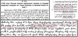 Firudin Ağasıoğlu (Cəlilov)  belə bir tarixi sənədi gün işığına çıxardı. Belə ki, 1723-cü ildə 4 Qarabağ (erməniləşmiş alban) məliyi Rusiya çarına göndərdiyi məktubda şikayət edirlər ki, ləzgilər və yerli Alban türkləri vaxtaşırı onlarla savaşır. Bu, albanların türk mənşəli olmasının bir sübutu ola bilər.