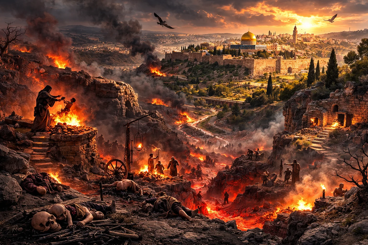 Tarixçilərin bir qismi qeyd edir ki, İsrail krallığı dövründə bəzi bütpərəst qruplar burada Molek adlı məbuda qurban mərasimləri həyata keçiriblər. Daha sonra kral Yoşiya bu ayinləri qadağan etmiş və ərazi şəhərin tullantı sahəsinə çevrilmişdir. Zamanla bura zibil və cəsədlərin atıldığı yer kimi istifadə olunmuş, tullantıların yandırılması nəticəsində alov və tüstü ilə assosiasiya edilmişdir.
