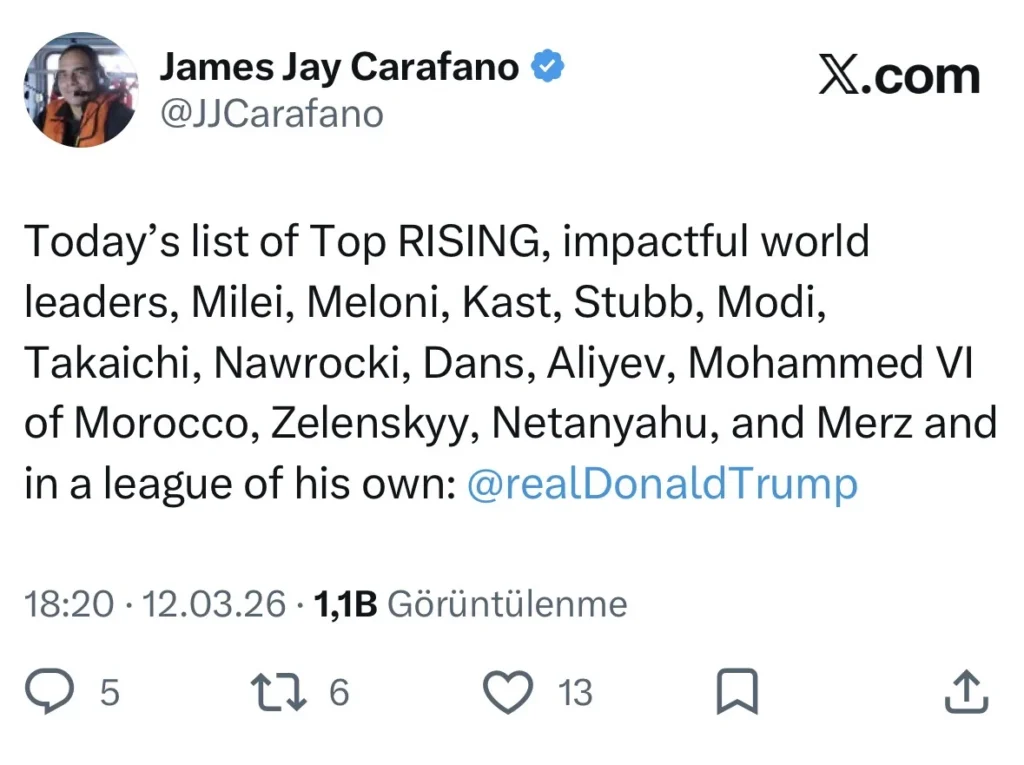 “Bugünkü siyahı dünyanın ən təsirli yüksələn liderlərini əhatə edir: Xavier Milei, Ciorcio Meloni, Xose Antonio Kast, Aleksandr Stubb, Narendra Modi, Sanae Takaiçi, Karol Navroçki, Gert Yan Dans, İlham Əliyev, Mərakeş kralı VI Mohammed, Volodimir Zelenski, Benyamin Netanyahu və Fridrix Mers.Onların hamısından ayrı bir liqada isə Donald Tramp yer alır.”