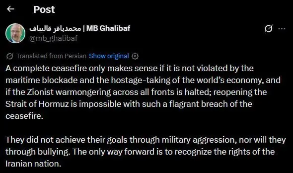 İran parlamentinin sədri Məhəmməd Baqir Qalibaf da sərt mövqe ortaya qoyub. Qalibaf bildirib ki, “tam atəşkəs” yalnız dəniz blokadası dayandırılarsa məna kəsb edə bilər və blokada qüvvədə qaldığı halda Hörmüz boğazının yenidən açılması mümkün deyil. Bu mövqe həm Reuters xülasəsində, həm də digər açıq mənbə xəbərlərində eyni məzmunda əks olunub.