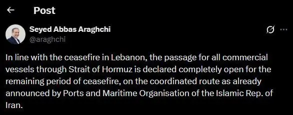 İran xarici işlər naziri Abbas Araqçi bildirib ki, Hörmüz boğazı atəşkəsin qalan müddəti ərzində bütün kommersiya gəmilərinin keçidi üçün tam açıq elan olunub. Onun sözlərinə görə, keçid İranın Limanlar və Dənizçilik Təşkilatının əvvəlcədən elan etdiyi razılaşdırılmış marşrut üzrə həyata keçiriləcək. Bu açıqlama Araqçinin sosial şəbəkə paylaşımında yer alıb və beynəlxalq media tərəfindən də təsdiqlənib.