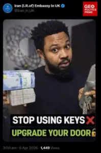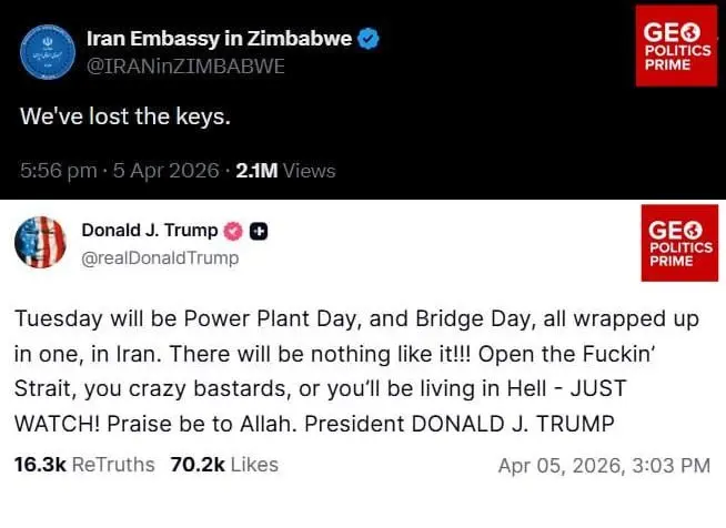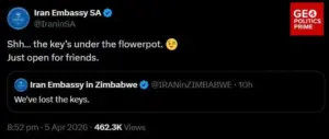 İranın Zimbabvedəki səfirliyinin rəsmi “X” hesabında “We’ve lost the keys” (“Açarları itirmişik”) paylaşımı edilib. Eyni xətt üzrə İranın Cənubi Afrikadakı səfirliyinin rəsmi hesabı isə “Shh… the key’s under the flowerpot. Just open for friends” (“Şşş… açar dibçəyin altındadır. Yalnız dostlar üçün açın”) yazaraq zarafatı davam etdirib. Hər iki paylaşım rəsmi diplomatik hesabların “X” postlarında görünür.