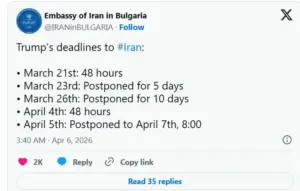 İranın bəzi xarici diplomatik missiyaları ABŞ prezidenti Donald Trampın Hörmüz boğazının açılması ilə bağlı sərt ultimatumuna sosial şəbəkələrdə istehzalı cavablar veriblər. Tramp aprelin 5-də “Truth Social” platformasında İranı boğazı açmağa çağırıb, əks halda ölkənin elektrik stansiyaları və körpüləri kimi infrastrukturuna zərbələr endiriləcəyi ilə hədələyib.