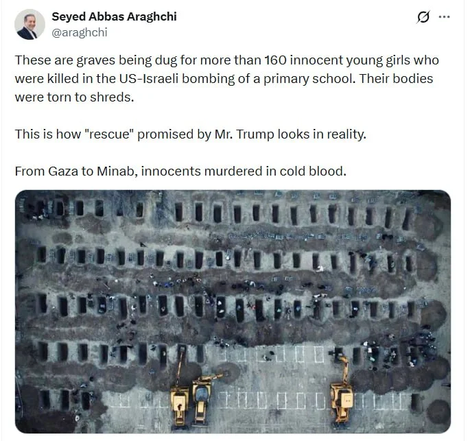 İranın xarici işlər naziri Abbas Araqçi ABŞ və İsrail hücumları nəticəsində vurulmuş məktəbdə həlak olan məktəblilər üçün qazılmış qəbirlərin fotosunu paylaşıb və müharibənin humanitar faciələrə yol açan tərəflərini göz önünə sərib.