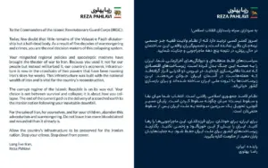 Rza Pəhləvi SEPAH komandanlığına açıq müraciət edərək rejimə dəstəyi dayandırmağa, “cinayətləri dayandırmağa” və İranı “yandırılmış torpaq” vəziyyətində qoymamağa çağırıb.