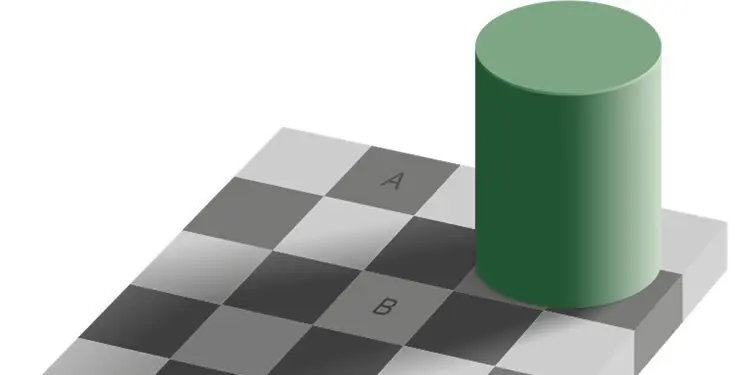 Rəng qavrayışının başqa bir maraqlı nümunəsi Adelsonun damalı-kölgə illüziyasıdır. Bu illüziyada A və B kimi işarələnmiş iki kvadrat əslində eyni rəngdə olsa da, beyin onları fərqli rənglər kimi qəbul edir. Bu da göstərir ki, rəngin necə görünməsi yalnız onun fiziki xüsusiyyətindən deyil, yerləşdiyi kontekstdən də asılıdır.