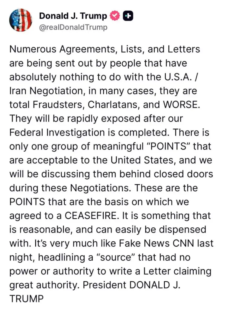 ABŞ Prezidenti Donald Tramp bildirib ki, Vaşinqtonla Tehran arasında aparılan danışıqlarla əlaqəsi olmayan çoxsaylı “sazişlər”, “siyahılar” və “məktublar” dövriyyəyə buraxılır və bunları yayanlar bir çox hallarda “fırıldaqçılar və şarlatanlar”dır.