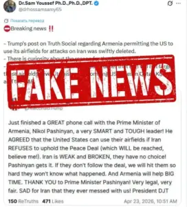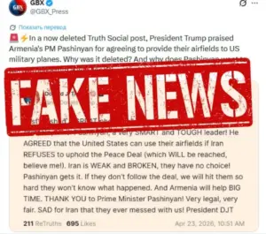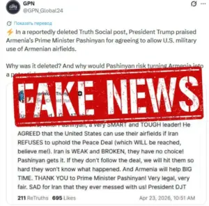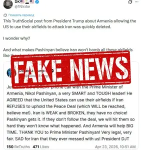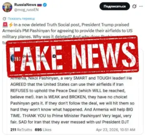 Sosial mediada Donald Trampın guya Nikol Paşinyanla telefon danışığı apardığı, Ermənistanın da İran sülh razılaşmasından imtina edəcəyi halda ABŞ hərbi aviasiyasına hava limanlarını açmağa razılaşdığını iddia edən məlumatlar yayılıb.