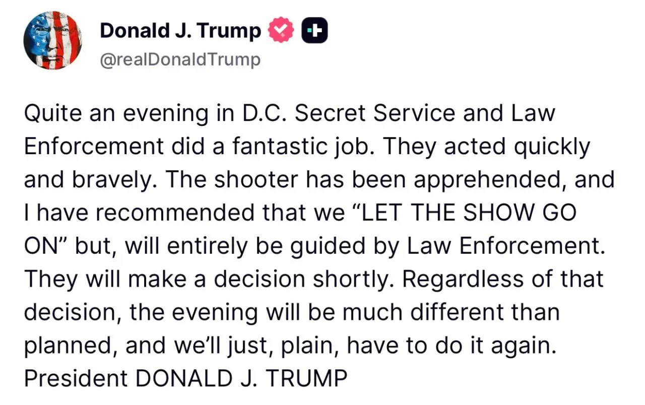 Tədbir əvvəlcə davam etdirilməyə çalışılsa da, təhlükəsizlik səbəbindən ləğv edilib. “Associated Press”-in məlumatına görə, təşkilatçılar ziyafətin daha sonra yenidən keçirilməsini planlaşdırır. Hadisə Trampın prezident kimi ilk dəfə Ağ Ev Müxbirləri Assosiasiyasının ziyafətində iştirak etdiyi axşam baş verib və yüksək səviyyəli tədbirlərdə təhlükəsizlik tədbirləri ilə bağlı yeni suallar yaradıb.