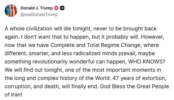 Donald Tramp İrana verilən son tarix ərəfəsində "Truth Social"-da sərt paylaşım edərək razılaşma olmazsa “bu gecə bütöv bir sivilizasiyanın yox ola biləcəyini” bildirib.