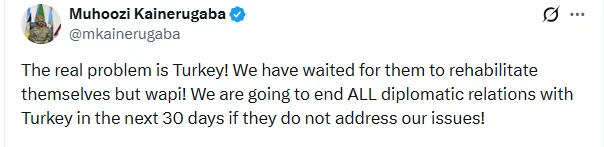 Uqanda Silahlı Qüvvələrinin rəhbəri general Muhoozi Kaineruqaba Türkiyə ilə bağlı sərt bəyanatla çıxış edib. O, dərhal Uqandaya bir milyard dollar köçürülməsini tələb edib. Onun ictimaiyyətə açıq paylaşımında Ankara “mövcud problemləri” həll etməyəcəyi təqdirdə, növbəti 30 gün ərzində Türkiyə ilə bütün diplomatik münasibətlərin kəsilə biləcəyi bildirilib. Regional media və sosial media üzrə görünən sitatlarda Kaineruqaba “Türkiyə ilə bütün diplomatik münasibətləri dayandıracağıq” məzmununda açıqlama verib; bəzi mənbələrdə onun əlavə olaraq Türkiyə hava nəqliyyatı bağlantılarını da hədəfə aldığı yazılıb.