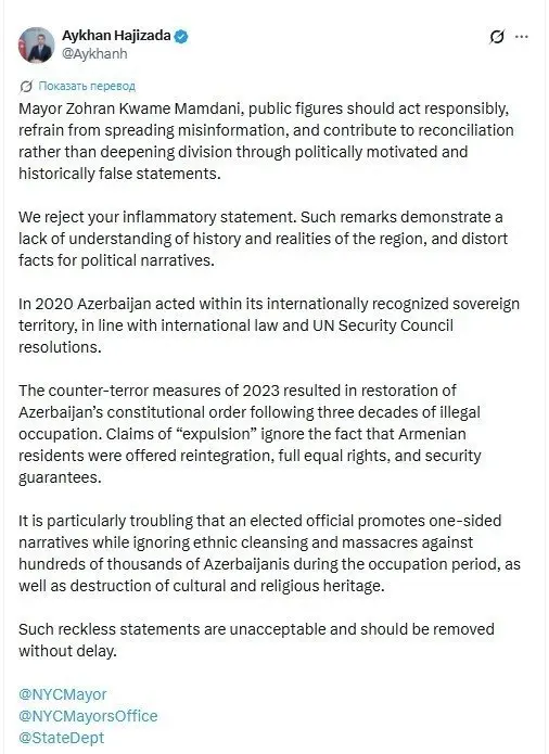 Azərbaycan Xarici İşlər Nazirliyinin mətbuat katibi Ayxan Hacızadə Nyu-York meri Zohran Kvame Mamdaninin Azərbaycanla bağlı paylaşımını tənqid edib. Hacızadə ictimai şəxsləri dezinformasiya yaymaqdan çəkinməyə və bölgədə barışığa töhfə verməyə çağırıb.